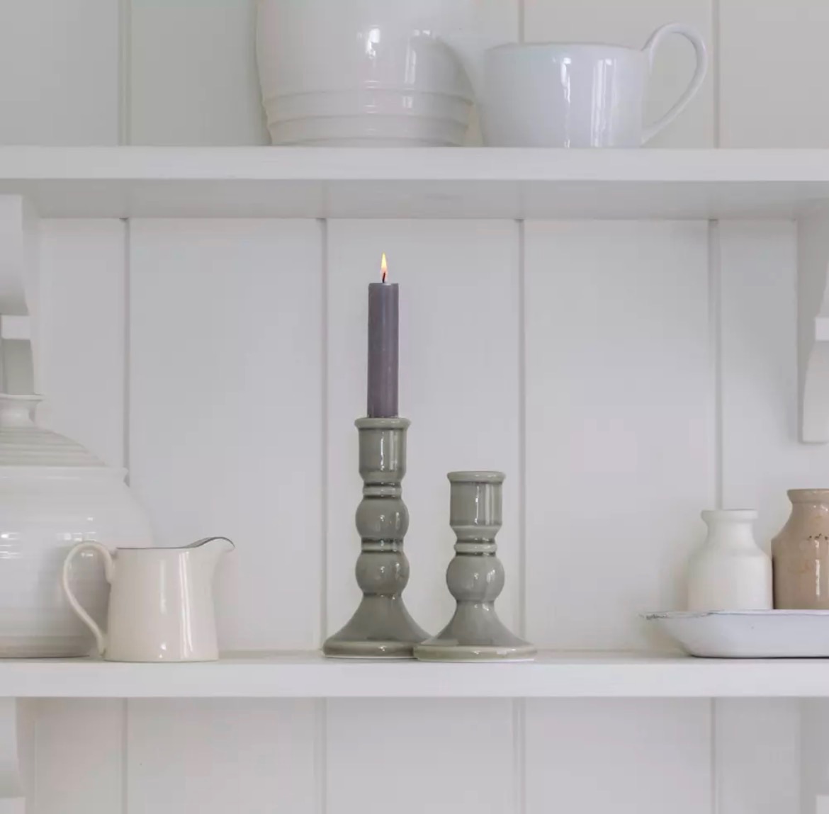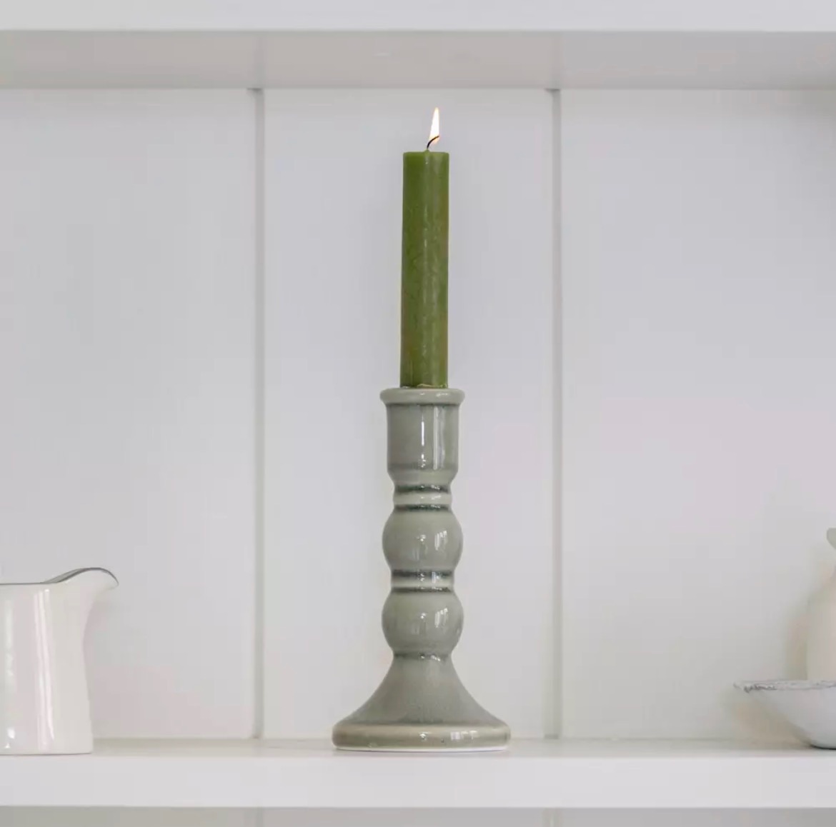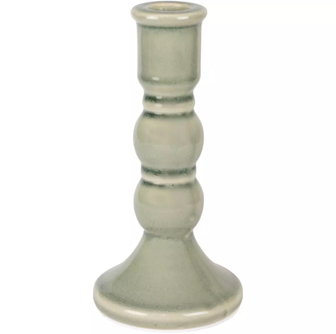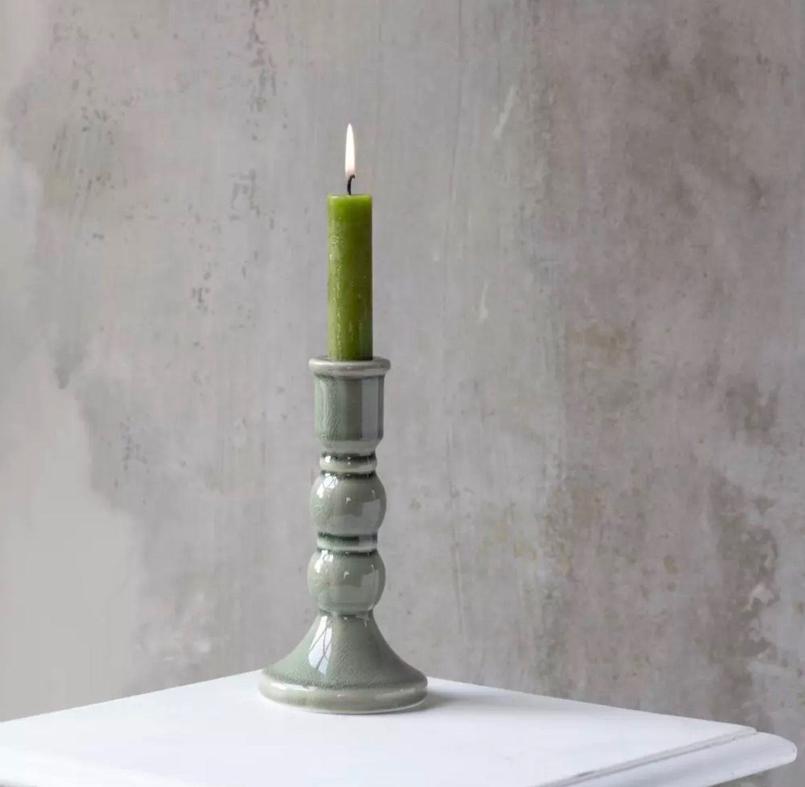 Size 8.5cm x 8.5cm x 17cm high featuring a muted green glaze. Holds regular dinner candle.