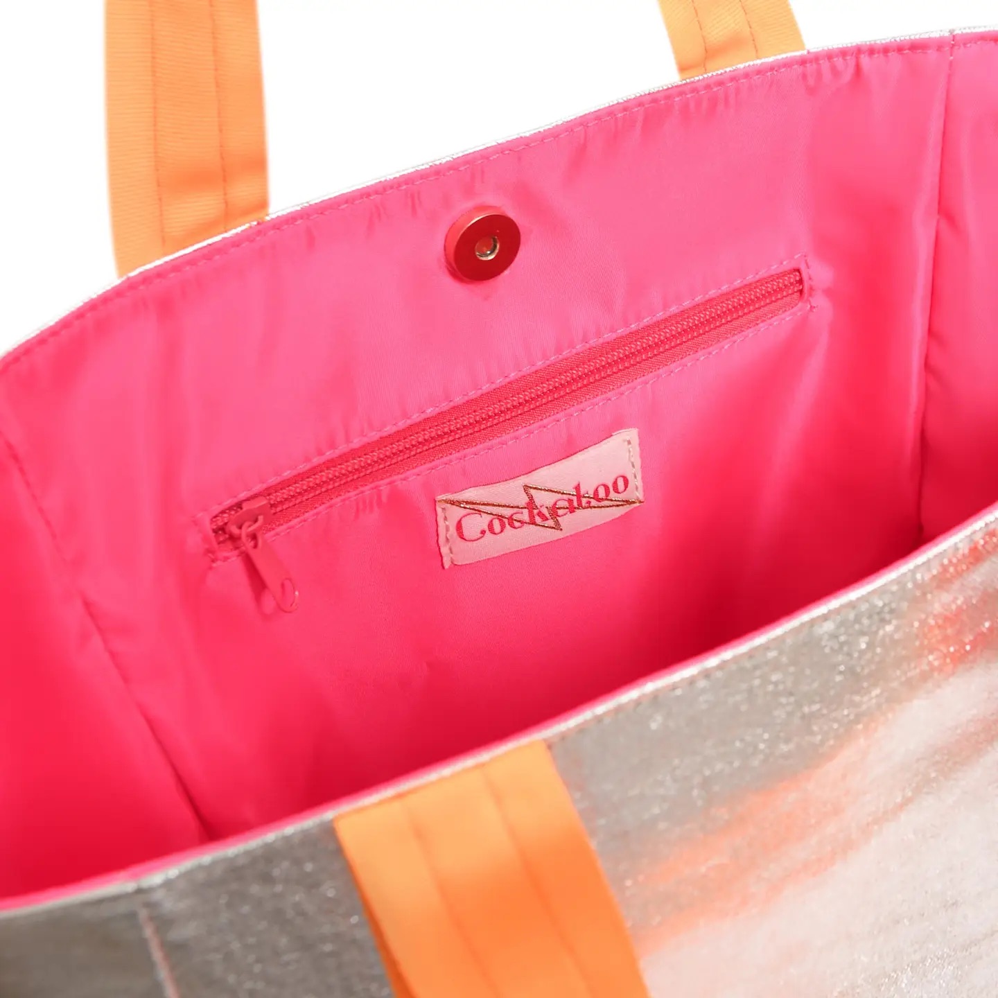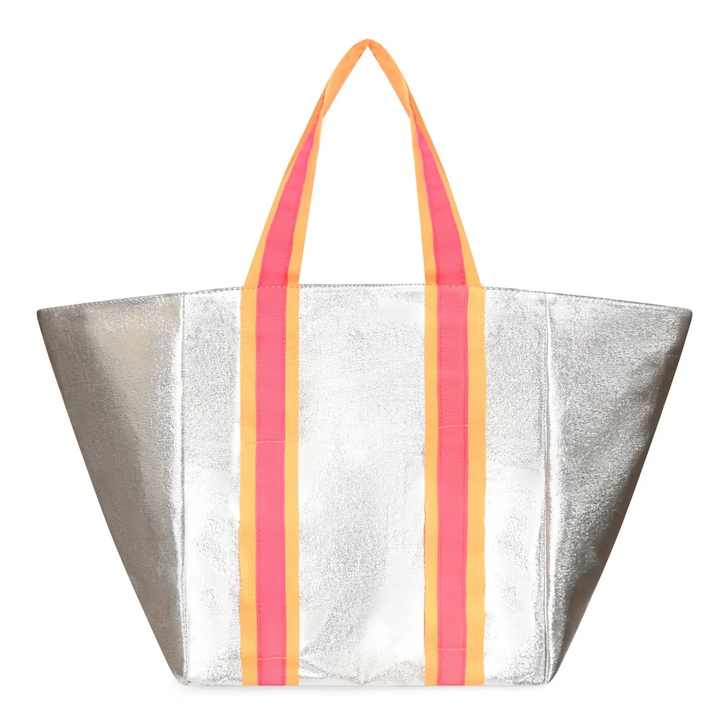 Approx. size 24cm x 22cm x 20cm.  Silver coated cotton canvas bag with hot striped handles. Fully lined with hot pink water resistant fabric, internal gold zipped up pocket and gold magnetic popper.  Slip straps on one side to store towel/jacket.