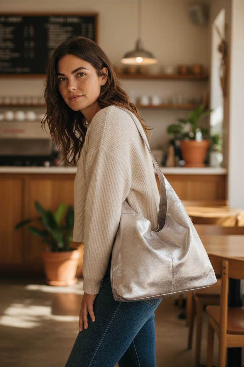Slouch bag in soft cowhide in metallic silver measuring 14x42x60cm