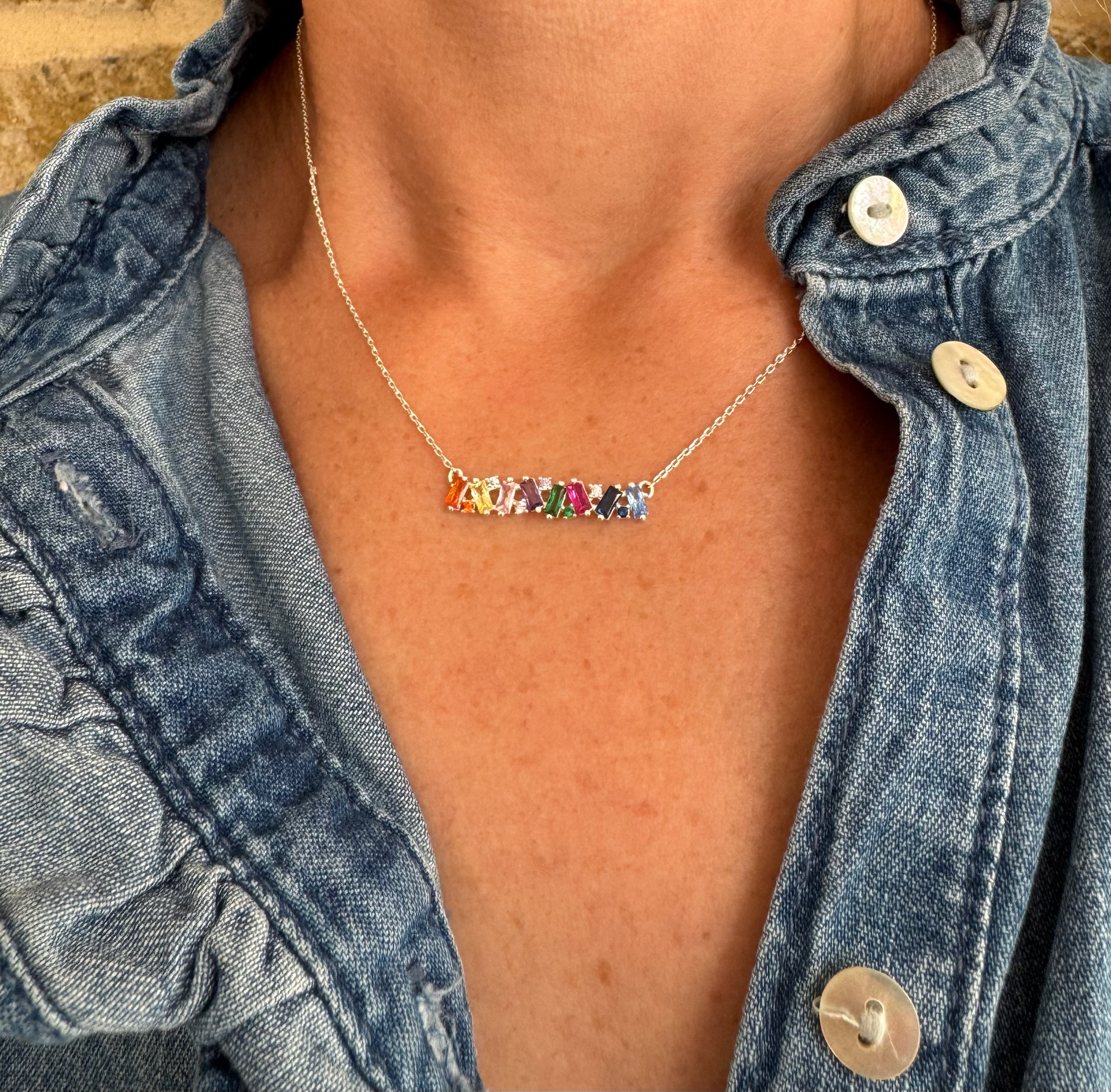 Rainbow Baguette Crystal Bar Necklace in silver