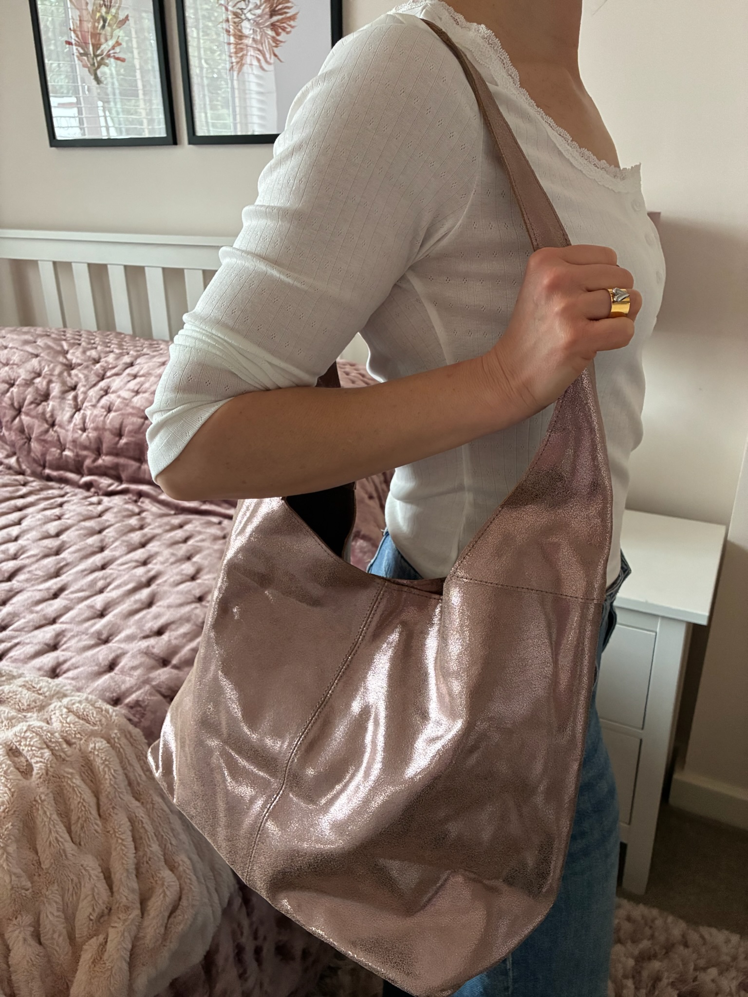 Rose Copper Metallica Slouch Cowhide BagAvailability: In stock