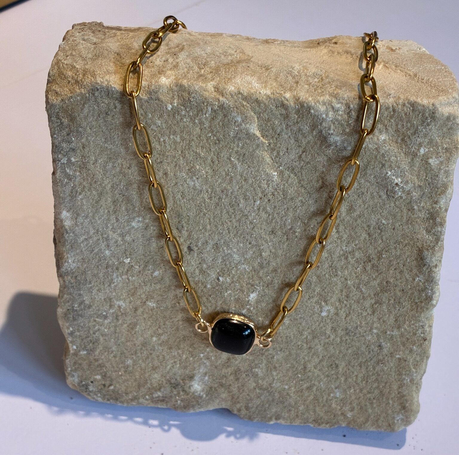 Linked paperclip shaped segments. Black Jade gemstone, gold plated stainless steel